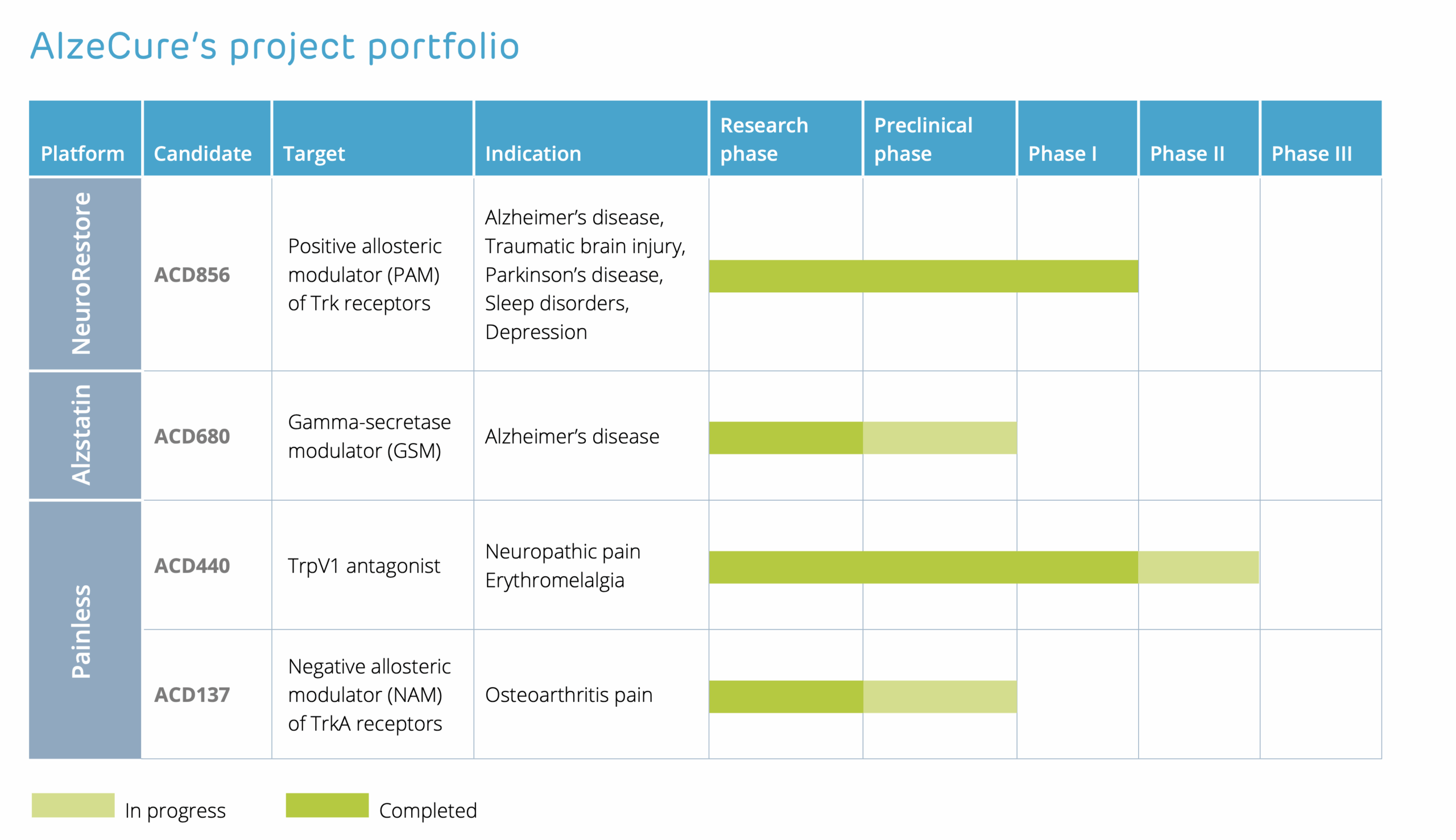 AlzeCure® works with several research platforms: NeuroRestore® and Alzstatin® – with a focus on Alzheimer’s disease, where the leading candidate ACD856 is in clinical development phase. Painless – focuses on pain treatment and contains two projects: ACD440 in clinical development phase and TrkA-NAM in research phase.