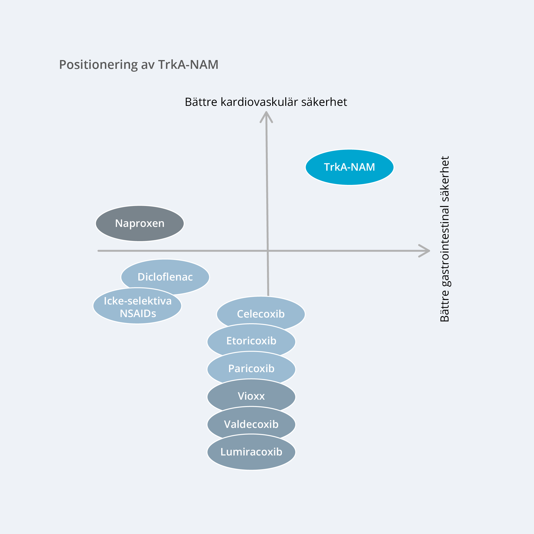 Målmekanismen har som tidigare nämnts en stark validering både prekliniskt och kliniskt och AlzeCures unika substanser differentierar sig med sin selektiva effekt på relevanta signalvägar så att optimal smärtstillande effekt kan uppnås utan att inducera sidoeffekter. TrkA-NAM substanserna är dessutom småmolekylära vilket både underlättar administrering för patienten (tablettform), men också bidrar till en mer kostnadseffektiv behandling. Det är dessutom en icke-opioid behandling, något som är viktigt för att erhålla framtida godkännande hos regulatoriska myndigheter, däribland FDA.